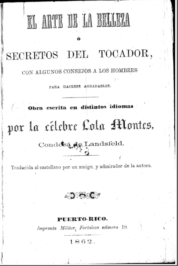 Este manual fue escrito por una mujer fascinante. Puede también considerarse como uno de los primeros libros escritos sobre cuidados belleza para la mujer. Su primera publicación se dio en el año 1858, en el idioma inglés, años más tarde se tradujo a varios idiomas; su autora no es nada más ni nada menos que Lola Montes.