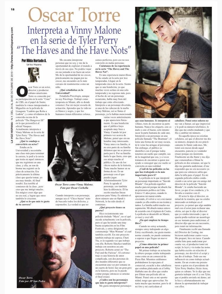 Oscar Torre es un actor ,director y productor cubano-americano. Torre es conocido por su participación en la serie “Cane” de CBS, en el papel de Santo; también lo vimos interpretando a Miguelito en la película de Liongaste“Ladrón que Roba a Ladrón”, y como olvidarnos la conocida escena de la película “The Hangover III” en la que personificó al oficial Vasquez. Actualmente interpreta a Vinny Malone en la serie de Tyler Perry “ The Haves and the Have Nots”.