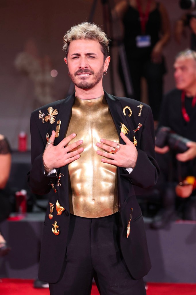 Osvaldo Supino, el multipremiado cantautor italiano, regresó a la muestra de Cine en Venecia. Para “Maldoror”, Osvaldo Supino caminó por la alfombra roja con un look totalmente nuevo y brillante, con un torso Vanni de oro puro y un esmoquin de Angelos Frentzos adornado con joyas de Ludmila Palamarchuk. Estilismo de Katrina Schirrnko.