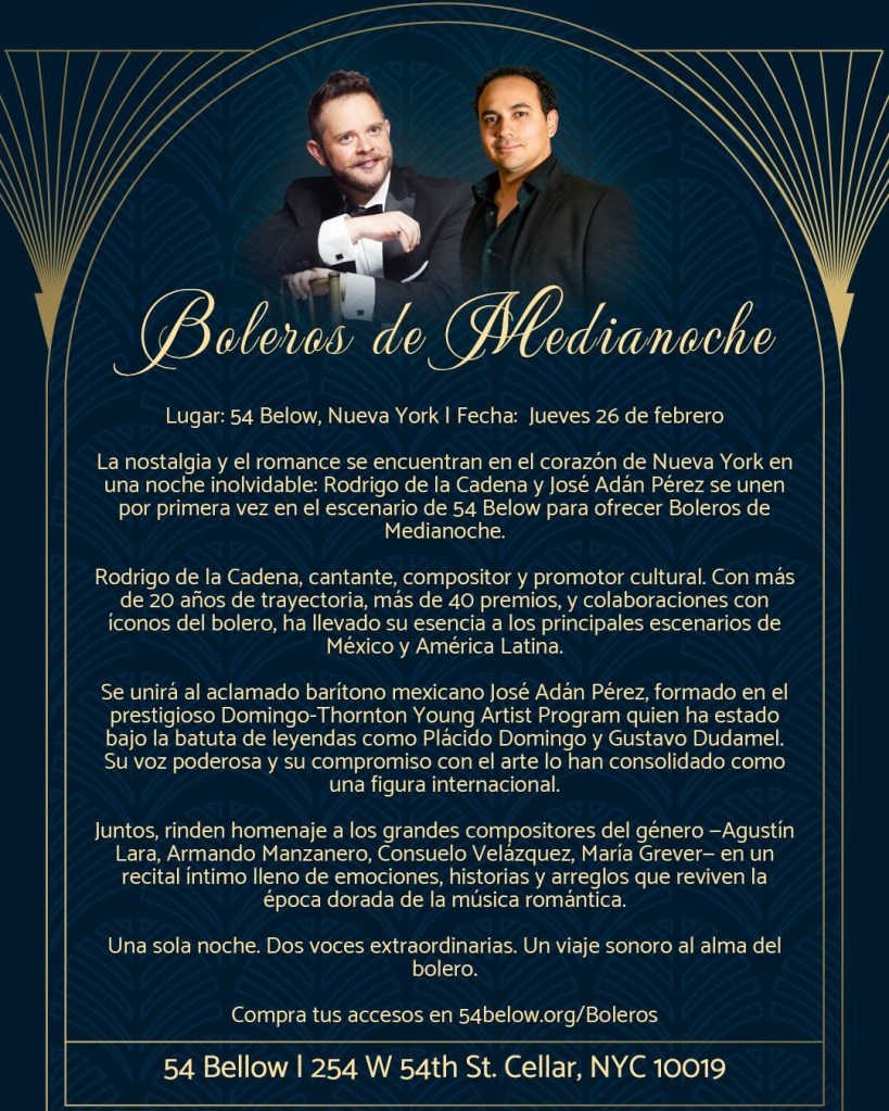 El próximo jueves 26 de febrero a las 9:30pm, el Embajador Mundial del Bolero Rodrigo de la Cadena y el cantante de Opera, José Adán Pérez se presentan por primera vez juntos en Nueva York en una noche dedicada a la gran tradición romántica latinoamericana.